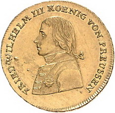 Los-Nummer: Auktion 51 - 515 Altdeutsche Münzen und Medaillen Brandenburg-Preußen Friedrich Wilhelm III. 1797-1840, Friedrichs d'or 1798 A. 'Friedenstyp'. Jaeger 101 , Friedberg 2425. #0Verwechselungsgefahr Fr. 2422} GOLD. Vorderseite leicht korrodiert, etwas berieben, vorzüglich Schätzpreis: 750,- Zuschlag: 650,- |