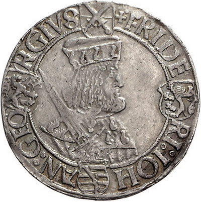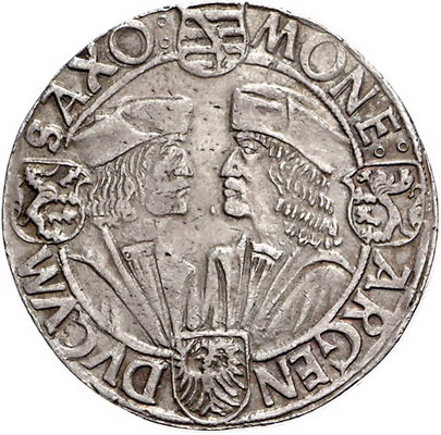 Los-Nummer: Auktion 51 - 1523 Altdeutsche Münzen und Medaillen Sachsen-Kurfürstentum Friedrich III., Johann und Georg 1507-1525, Klappmützentaler, Annaberg. Münzzeichen Kreuz. Brustbild Friedrichs im Kurornat mit geschultertem Schwert nach rechts / Die Brustbilder Johann und Georgs einander gegenüber. Keilitz 44.1, Schnee 19, Davenport 9709, Schulten 2996. Sehr schön + Schätzpreis: 1000,- Zuschlag: 950,- |