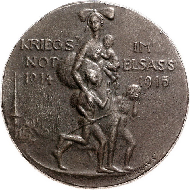 Los-Nummer: Auktion 51 - 2520 Medaillen Erster Weltkrieg Einseitige Eisengussmedaille o.J. (1915), von Kraus. Auf die Kriegsnot im Elsass. Dem brennenden Ort entkommene Frau mit drei Kindern. 97 mm. Sehr schön - vorzüglich Schätzpreis: 100,- Zuschlag: unverkauft |