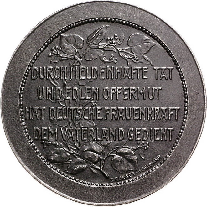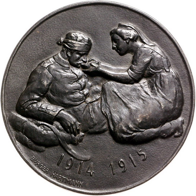 Los-Nummer: Auktion 51 - 2519 Medaillen Erster Weltkrieg Eisengussmedaille 1915, von Burger-Hartmann. Auf die deutsche Frauenkraft. Kniende Rotkreuzschwester hält verwundetem Soldaten Schale zum trinken an die Lippen / Vier Zeilen Schrift über Lorbeerzweig. 107 mm. Vorzüglich Schätzpreis: 100,- Zuschlag: 80,- |
