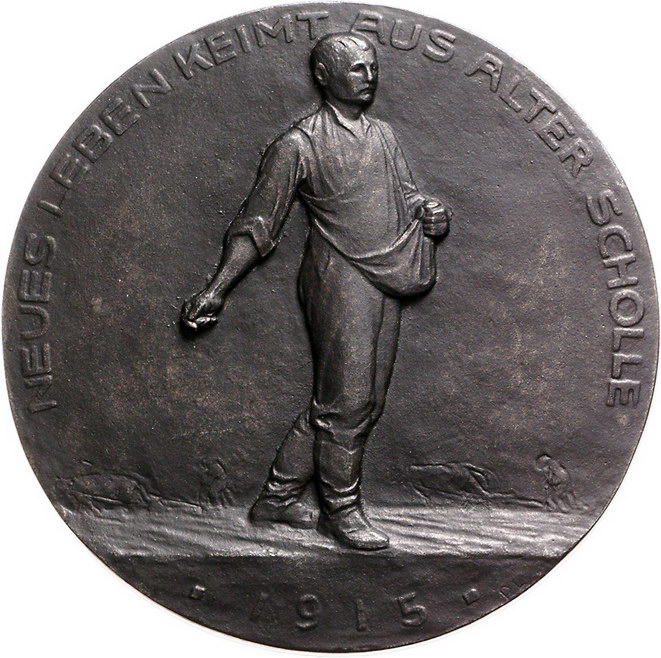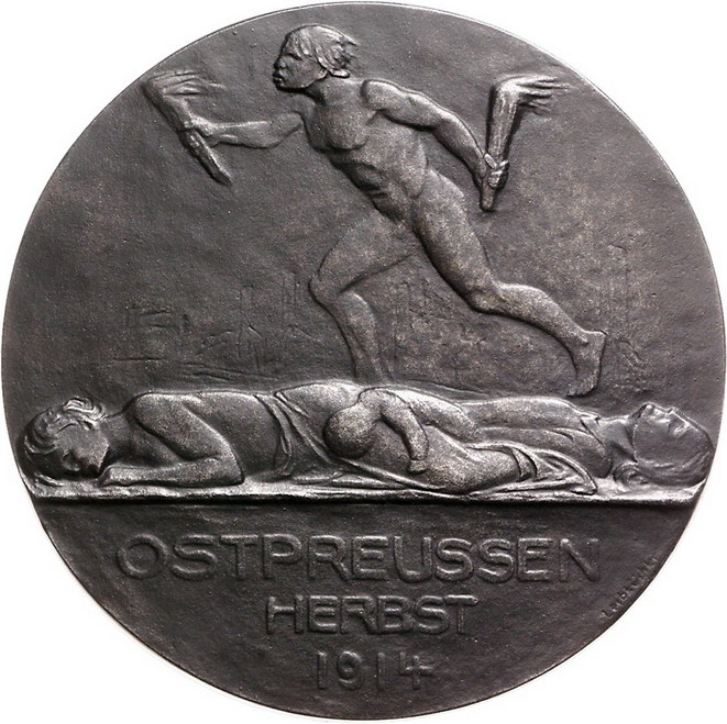 Los-Nummer: Auktion 51 - 2517 Medaillen Erster Weltkrieg Eisengussmedaille o.J. (1915), von Leibküchler. Auf das neu erwachte Ostpreußen nach Abzug der Kriegsfurie. Säender Bauer, im Hintergrund ackernde Gespanne / Nackte männliche Furie über zwei liegenden toten Frauen mit Kind, im Hintergrund Ruinen. 106 mm. Vorzüglich Schätzpreis: 125,- Zuschlag: unverkauft |
