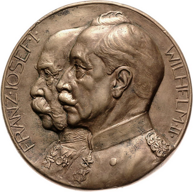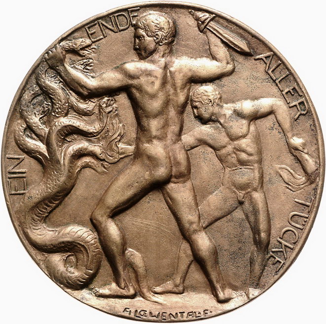 Los-Nummer: Auktion 51 - 2510 Medaillen Erster Weltkrieg Bronzegussmedaille o.J. (um 1914), von Löwenthal. Gestaffelte Brustbilder Wilhelm II. und Franz Josef I. nach links / Zwei nackte Krieger kämpfen mit Schwert und Fackelfeuer gegen Hydra. 122 mm. Sehr schön Schätzpreis: 100,- Zuschlag: unverkauft |