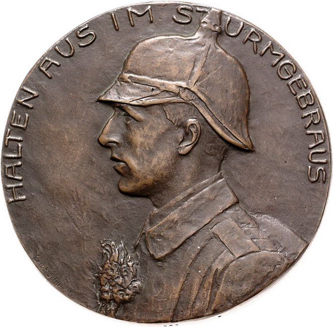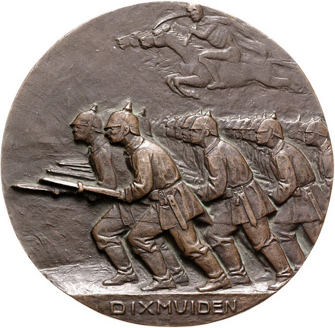 Los-Nummer: Auktion 51 - 2508 Medaillen Erster Weltkrieg Bronzegussmedaille 1914, von Leibküchler. Auf die Kriegsfreiwilligen von Dixmuiden. Infanteristenportrait nach links / Sturm eines Infanteristenbataillons, darüber reitender Tod. Zetzmann 4059 (Ag). 104 mm. Vorzüglich Schätzpreis: 150,- Zuschlag: 150,- |
