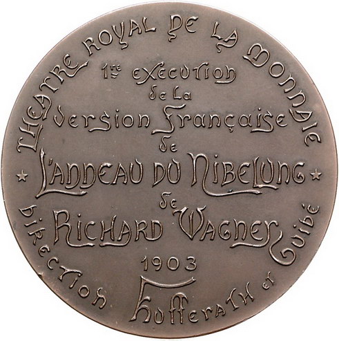 Los-Nummer: Auktion 51 - 2421 Medaillen Musiker Wagner, Richard *1813 Leipzig, +1883 Venedig, Bronzemedaille 1903, von Braeke. Auf die erste Aufführung des Zyklus 'Ring der Nibelungen' in französischer Sprache von Richard Wagner. Brustbild einer Walküre nach links / Acht Zeilen Schrift. Niggl 2146. 59 mm. Vorzüglich Schätzpreis: 75,- Zuschlag: 190,- |