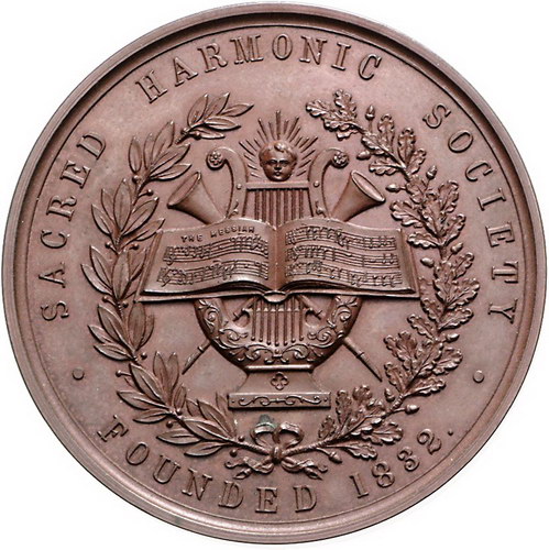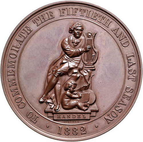 Los-Nummer: Auktion 51 - 2412 Medaillen Musiker Händel, Georg Friedrich *1685 Halle/Saale, +1759 London, Bronzemedaille 1882, von Pinches. Auf die 50. und letzte Saison der 1832 gegründeten 'Sacred Harmonic Society'. Händel Statue / Musikattribute in Kranz. Niggl 802. 51 mm. Originaletui. Vorzüglich - Stempelglanz Schätzpreis: 100,- Zuschlag: 80,- |