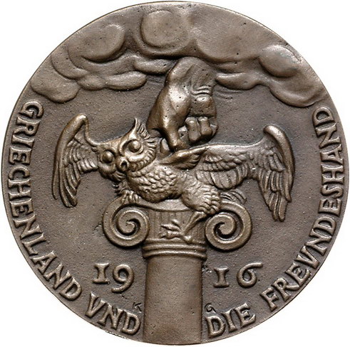 Los-Nummer: Auktion 51 - 2364 Medaillen Münchner Medailleure Goetz, Karl Bronzegussmedaille 1916. Auf den Rückzug der britischen und französischen Armee aus Mazedonien und deren Landung in Saloniki. Hand aus Wolken drückt Eule auf Säule / Griechische Gottheit wird von zwei Schiffsinsassen gefesselt. Kienast 170. 56 mm. Vorzüglich Schätzpreis: 125,- Zuschlag: 230,- |