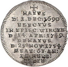 Los-Nummer: Auktion 51 - 1919 Altdeutsche Münzen und Medaillen Würzburg, Bistum Karl Philipp von Greiffenklau-Vollraths 1749-1754, Groschen 1754. Auf seinen Tod. Helmschrott 687. Fast Stempelglanz Schätzpreis: 175,- Zuschlag: unverkauft |