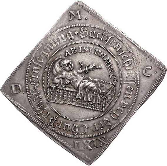 Los-Nummer: Auktion 51 - 1565 Altdeutsche Münzen und Medaillen Sachsen-Albertinische Linie Johann Georg II. 1656-1680, Talerklippe 1669. Auf das Büchsenschießen anlässlich der Einsegnung Johann Georgs IV. Kindlicher, in Wiege liegender Herkules erwürgt die Schlange des Bösen, in den Ecken aufgeteilt römische Jahreszahl / Monogramm aus IG4, in den Ecken vier Schilde. Slg. Merseburger 1298, Schnee 928, Davenport 7632. Schöne Patina. Vorzüglich Schätzpreis: 1500,- Zuschlag: unverkauft |