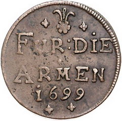 Los-Nummer: Auktion 51 - 1173 Altdeutsche Münzen und Medaillen Münster, Bistum Friedrich Christian von Plettenberg 1688-1706, Cu Armenpfennig 1699, St. Martini. Schulze 160 d , Weingärtner 235. Sehr schön Schätzpreis: 125,- Zuschlag: 100,- |