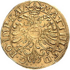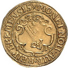 Los-Nummer: Auktion 51 - 691 Altdeutsche Münzen und Medaillen Bremen, Stadt Goldgulden 1613. Münzzeichen gekreuzte Zainhaken. Münzmeister Ippo Ritzema. Mit Namen und Titel Matthias'. Bremer Schlüssel in verschnörkeltem Schild, unten die geteilte Jahreszahl / Gekrönter Doppeladler mit Reichsapfel auf der Brust. Jungk 402, Friedberg 398 , Slg. Danziger -. Von größter Seltenheit. Vorzüglich Schätzpreis: 20000,- Zuschlag: 17250,- |