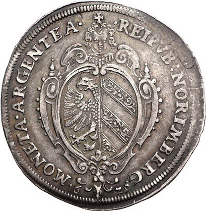 Los-Nummer: Auktion 51 - 1278 Altdeutsche Münzen und Medaillen Nürnberg, Stadt Taler 1629. Zweigeteiltes Wappen in ovaler Kartusche, darüber Engelsköpfchen / Gekrönter Doppeladler mit Brustschild. Kellner 238, Slg. Erlanger 434/435, Davenport 5645. Leichter Kratzer, sehr schön Schätzpreis: 500,- Zuschlag: 480,- |