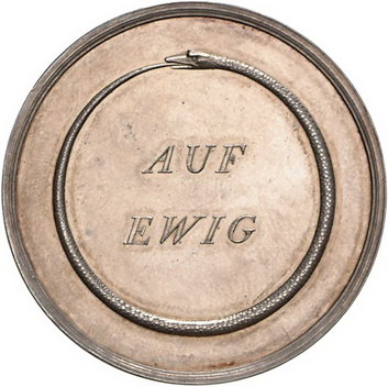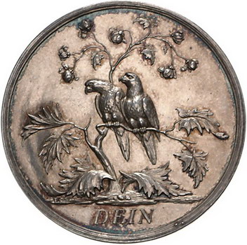 Los-Nummer: Auktion 51 - 2288 Medaillen Gelegenheitsmedaillen Medaillen von Daniel Friedrich Loos Medaille o.J. (um 1799) von Loos und Döll. Für Liebende zur Versicherung unzertrennlicher Freundschaft. Zwei Papageien auf exotischem Strauch / Zwei Zeilen Text in Schlangenring. Sommer B 67 , Bruhn 118. 36 mm, 12,25 g. Originaletui. Vorzüglich Schätzpreis: 75,- Zuschlag: 145,- |