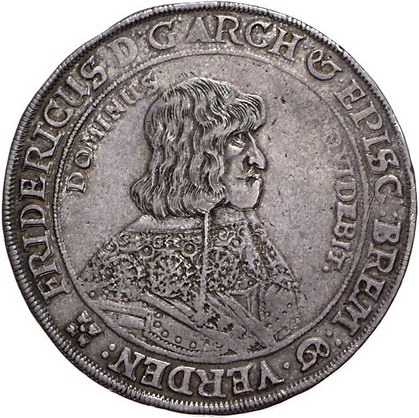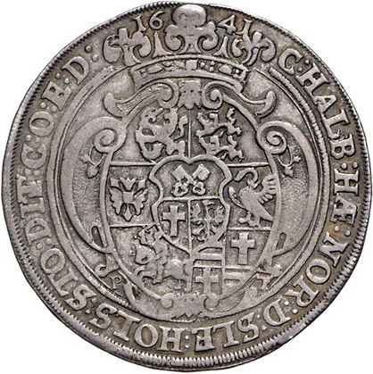 Los-Nummer: Auktion 51 - 687 Altdeutsche Münzen und Medaillen Bremen, Erzbistum Friedrich, Prinz von Dänemark, 1634-1646, Taler 1641 PT, Bremervörde. Münzmeister Peter Timpfe. Hüftbild des Erzbischofs nach rechts / Gekröntes, verziertes sechsfeldiges Wappen, darauf dreifeldiger deutscher Mittelschild, unten an den Seiten die Münzmeisterinitialen. Jungk 364, Hede 1, Lange 61 var , Davenport 5078 A, Slg. Danziger 284. Äußerst selten. Sehr schön Schätzpreis: 5000,- Zuschlag: 4400,- |