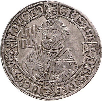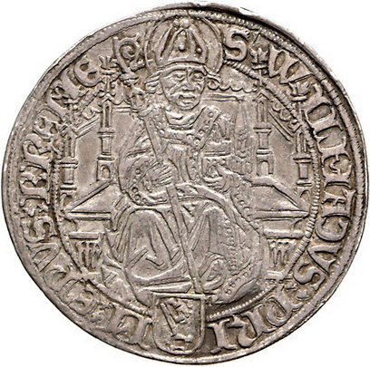 Los-Nummer: Auktion 51 - 682 Altdeutsche Münzen und Medaillen Bremen, Erzbistum Christoph von Braunschweig 1511-1558, Taler (Gulden zu 36 Grote) o.J. (1511-14), Bremen. Administratorische Prägung. CRISTOF - D G S BRE - ME ET VE - RD EC AD St. Petrus in halber Figur mit Schlüssel und Buch, in der Umschrift die vier Wappenschilde von Braunschweig, Bremen, Verden und Lüneburg / S WILHADVS PRI - M EPVS BREME Thronender Heiliger mit Krummstab und Buch über Bremer Stadtwappen. Jungk 151, Davenport 8974, Welter 344 , Slg. Danziger 116, Schulthess-Rechberg 3205, Madai 721, Fiala 235, Slg. Müller-Alinenhof 304, Slg. Bonin 2890, Slg. Brand I 982. Äußerst selten. Schöne Patina. Vorzüglich Schätzpreis: 40000,- Zuschlag: 45000,- |