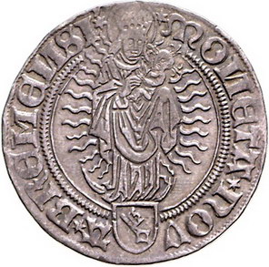 Los-Nummer: Auktion 51 - 681 Altdeutsche Münzen und Medaillen Bremen, Erzbistum Johann III. von Rode 1497-1511, 1/3 Taler o.J., Bremen. Behelmter vierfeldiger Wappenschild / Auf einer Mondsichel Madonna mit Kind in Flammenglorie, unten das Bremer Stadtwappen. Jungk 107 , Slg. Danziger 80. Von größter Seltenheit. Schöne Patina. Sehr schön - vorzüglich Schätzpreis: 2500,- Zuschlag: 4600,- |