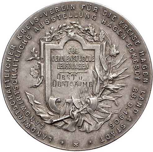 Los-Nummer: Auktion 51 - 844 Altdeutsche Münzen und Medaillen Hagen, Stadt Prämienmedaille 1905 der landwirtschaftlichen Ausstellung für Obstbau. Pferd steht nach rechts, im Hintergrund Schafe, Ziegen und eine Kuh neben Bäumen / Verzierte Schrifttafel. 50 mm, 45,13 g. Mattiert. Vorzüglich Schätzpreis: 75,- Zuschlag: 120,- |