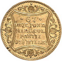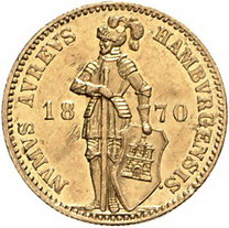 Los-Nummer: Auktion 51 - 882 Altdeutsche Münzen und Medaillen Hamburg-Stadt Dukat 1870. Jaeger 93 b, AKS 11, Friedberg 1142, Divo/Schramm 80. GOLD. Fassungsspuren, kl. Kratzer, vorzüglich Schätzpreis: 125,- Zuschlag: 260,- |