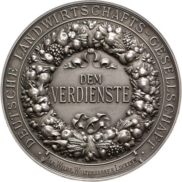 Los-Nummer: Auktion 51 - 903 Altdeutsche Münzen und Medaillen Hannover, Stadt Silberne Prämienmedaille 1914, von Schwenzer. Prämie der Deutschen Landwirtschafts-Gesellschaft. Germania mit Schild und Pflug steht vor Landschaft mit Feld und Weide / Schrift in Ähren- und Früchtekranz. 65 mm, 139,50 g. Im lederbezogenen Originaletui. Etui leicht bestoßen. Mattiert, winz. Randfehler, vorzüglich + Schätzpreis: 100,- Zuschlag: 140,- |