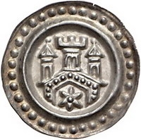 Los-Nummer: Auktion 51 - 1456 Altdeutsche Münzen und Medaillen Ravensburg, königliche Münzstätte Konrad IV. 1250-1254, Brakteat. 0,48 g. Torburg mit drei Türmen und einem Stern im Portal. Cahn 208, Slg. Bonhoff 1846, Slg. Wüthrich 260, Berger 2551, Klein/Ulmer 215. Vorzüglich - Stempelglanz Schätzpreis: 100,- Zuschlag: 80,- |