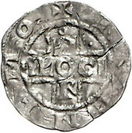 Los-Nummer: Auktion 51 - 39 Altdeutsche Münzen und Medaillen Andernach, königliche und bischöfliche Münzstätte Erzbischof Pilgrim 1021-1036 und Kaiser Konrad II. 1027-1039, Pfennig. 0,96 g. Ohne Namen des Münzherrn. END-EOR Kirche, auf der Front LR-NA / RVCNEMO Kreuzförmig angeordneter Name ?-ILOCI-R. Hävernick 735 b, Dannenberg II,1537. Schön - sehr schön Schätzpreis: 100,- Zuschlag: 140,- |