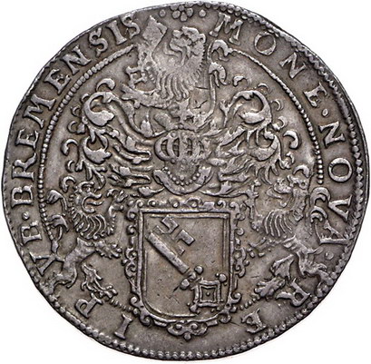 Los-Nummer: Auktion 51 - 695 Altdeutsche Münzen und Medaillen Bremen, Stadt Taler 1622. Münzmeister Johann Wientjes. Mit Namen und Titel Ferdinands II. Von zwei Löwen gehaltener, verzierter und behelmter spanischer Wappenschild mit Bremer Schlüssel, oben halber Löwe mit Schlüssel / Gekrönter Doppeladler mit Reichsapfel auf der Brust. Jungk 457, Davenport 5086 , Slg. Danziger 396, Slg. Müller-Alinenhof 379, Slg. Lehmann 2215. Äußerst selten. Sehr schön - vorzüglich Schätzpreis: 4000,- Zuschlag: 5400,- |