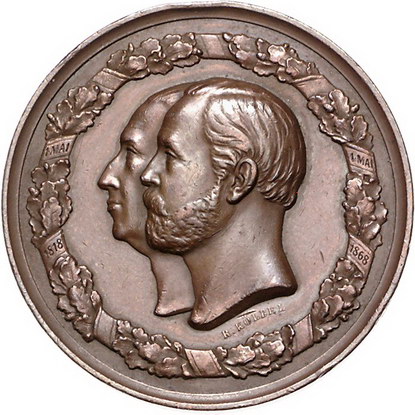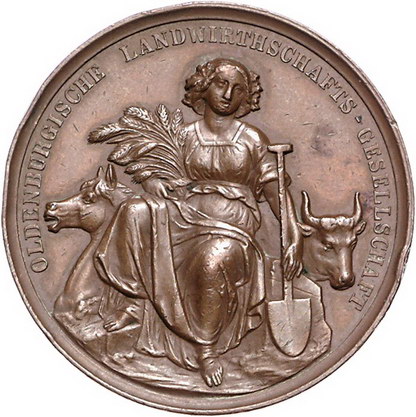 Los-Nummer: Auktion 51 - 1335 Altdeutsche Münzen und Medaillen Oldenburg, Stadt Bronzemedaille o.J. (1868), von Kölbel und Fitger. Auf die Oldenburgische Landwirtschaftsgesellschaft. Die Köpfe des Großherzogs Nicolaus Friedrich Peter und seines Vaters Paul Friedrich August nach links in Eichenkranz / Sitzende weibliche Gestalt mit Attributen der Landwirtschaft. Oldenburger Münzfreunde Bd. 5, 25.2. 42 mm. Kl. Randfehler, sehr schön Schätzpreis: 75,- Zuschlag: 75,- |