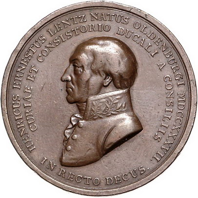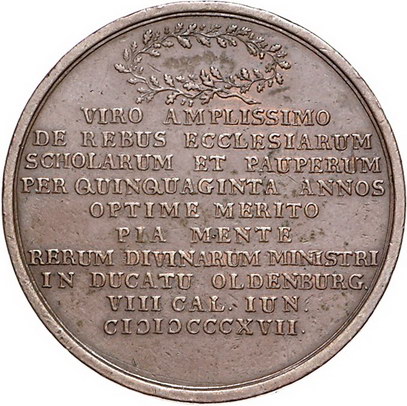 Los-Nummer: Auktion 51 - 1333 Altdeutsche Münzen und Medaillen Oldenburg, Stadt Bronzemedaille 1817, von König. Auf das 50jährige Dienstjubiläum des Oldenburger Konsistorialrates Heinrich Ernst Lentz. Brustbild im Rock und mit hohem Kragen nach links / Eichenkranz über zehn Zeilen Schrift. Oldenburger Münzfreunde Bd. 3, 1995, 26. 41,6 mm. Sehr schön Schätzpreis: 125,- Zuschlag: 100,- |